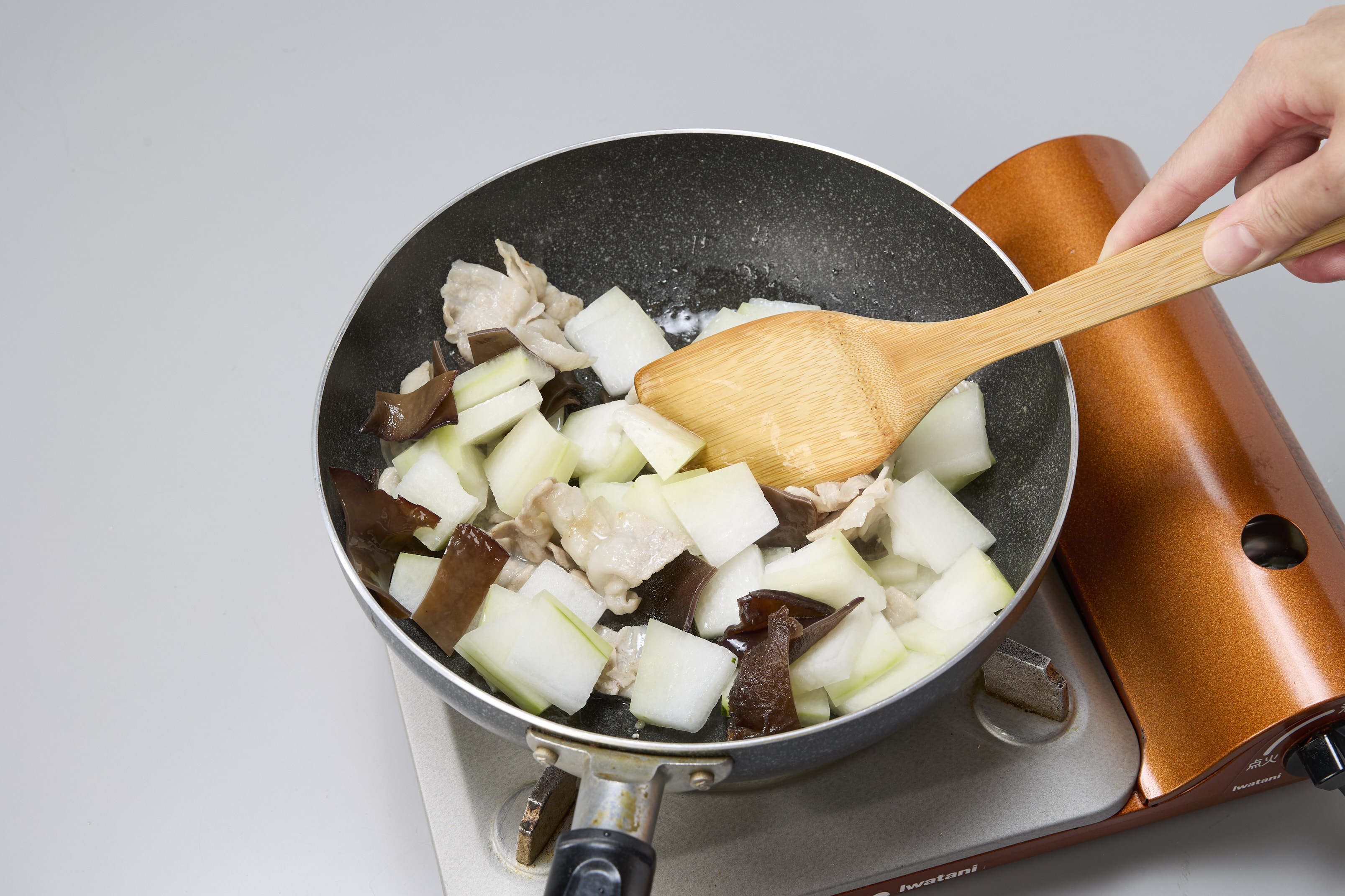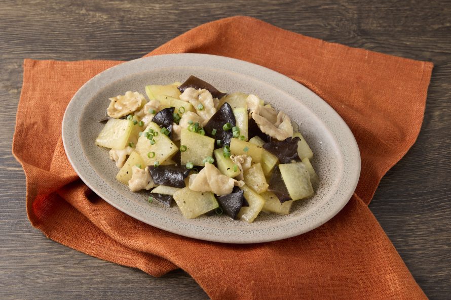 フライパンにサラダ油を熱し、豚バラ肉を炒め、軽く塩・こしょうをふり、火が通ったら①の冬瓜と② のキクラゲを加えて炒め合わせる。
