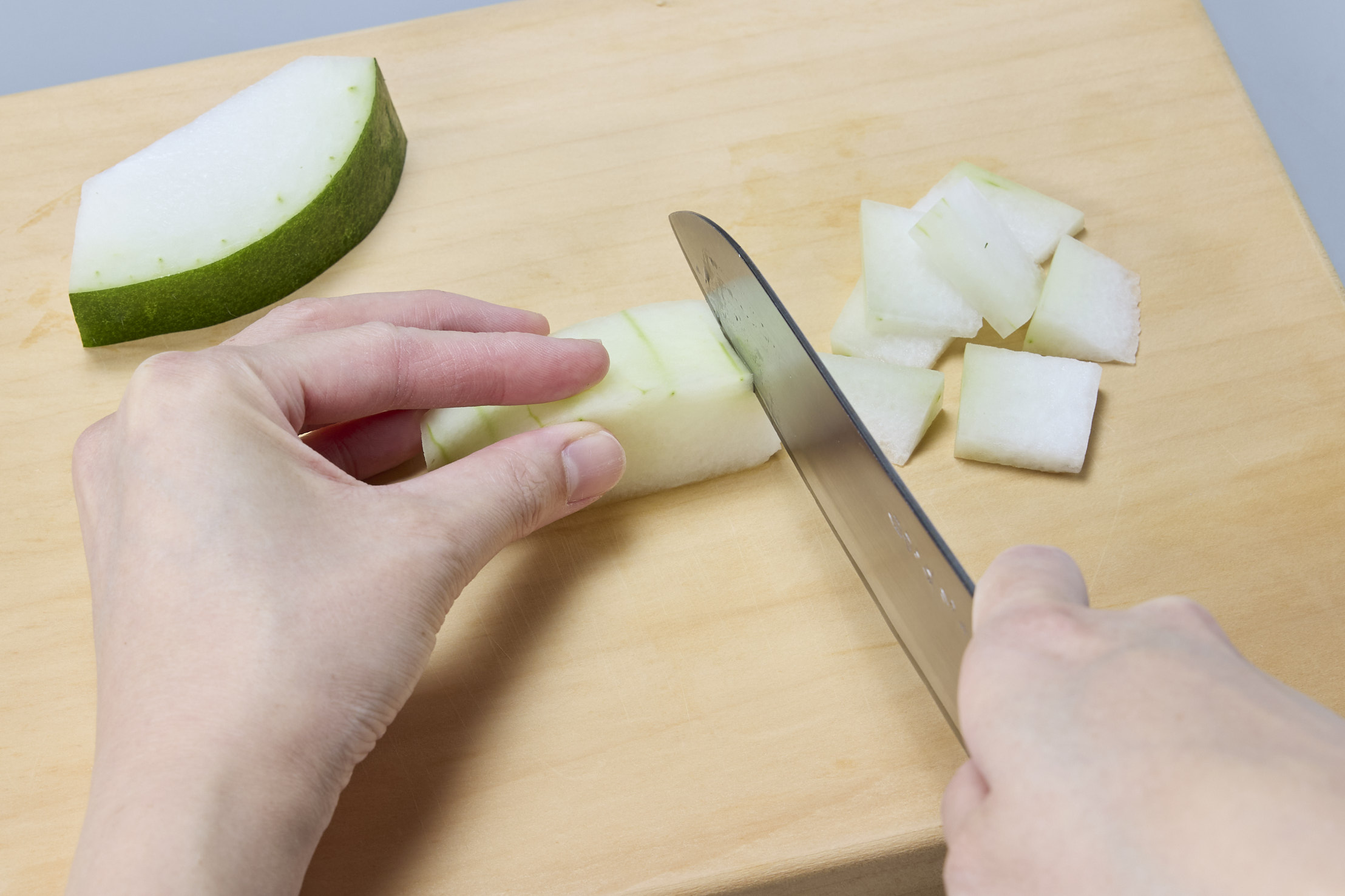 冬瓜は3センチ幅ほどの長さに切ってからタネを除き、皮をむいて、7~8ミリ幅の薄切りにする。